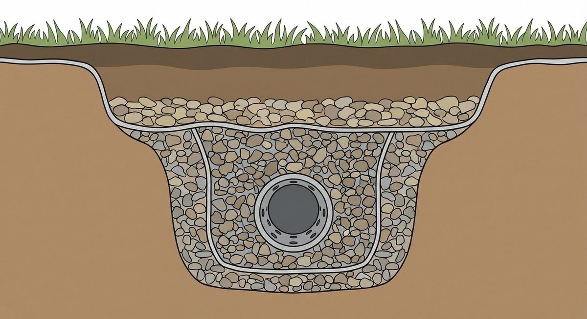 A geotextile membrane is laid in the trench to prevent fine soil particles from migrating into the gravel and causing blockages. Clean, angular aggregate is then placed around the perforated pipe, ensuring consistent water flow throughout the system.